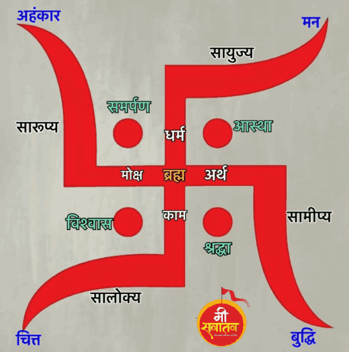 рд╕реНрд╡рд╕реНрддрд┐рдХрд╛рдЪреНрдпрд╛ рдЪрд╛рд░ рднреБрдЬрд╛ рдзрд░реНрдо, рдЕрд░реНрде, рдХрд╛рдо рдЖрдгрд┐ рдореЛрдХреНрд╖ рдпрд╛ рдЪрд╛рд░ рдкреБрд░реБрд╖рд╛рд░реНрдерд╛рдВрдЪреЗ рдкреНрд░рддреАрдХ рдЖрд╣реЗрдд: